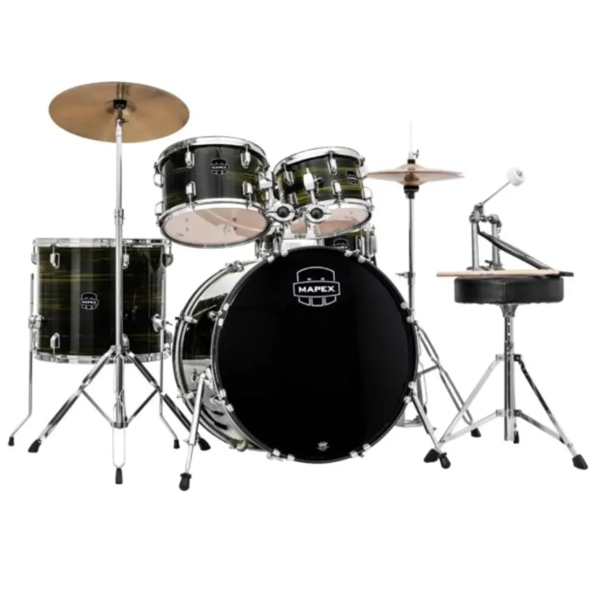 Bateria Mapex Comet 5 peças, Bumbo 22X16″, Surdo de chão 16X14″, Tons 10×7″, 12X8″, Caixa em madeira 14X5″. 1 estante de prato reta, 1 banco, 1 pedal de bumbo, 1 par de baquetas, acabamento revestido.