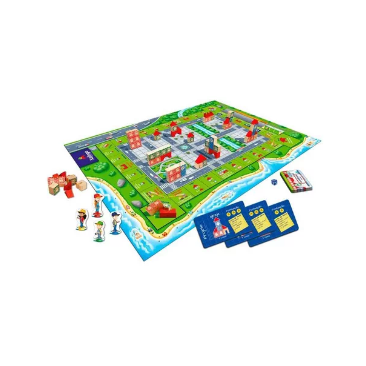 O jogo é composto por: 1 tabuleiro 54 x 72 cm, feito em cartão super resistente; 4 Peões de personagens em madeira reflorestada; 1 Dado; 72 Blocos de construção Brincando de Engenheiro e 27 Cartas de projeto. Indicado para crianças a partir dos 8 anos.
