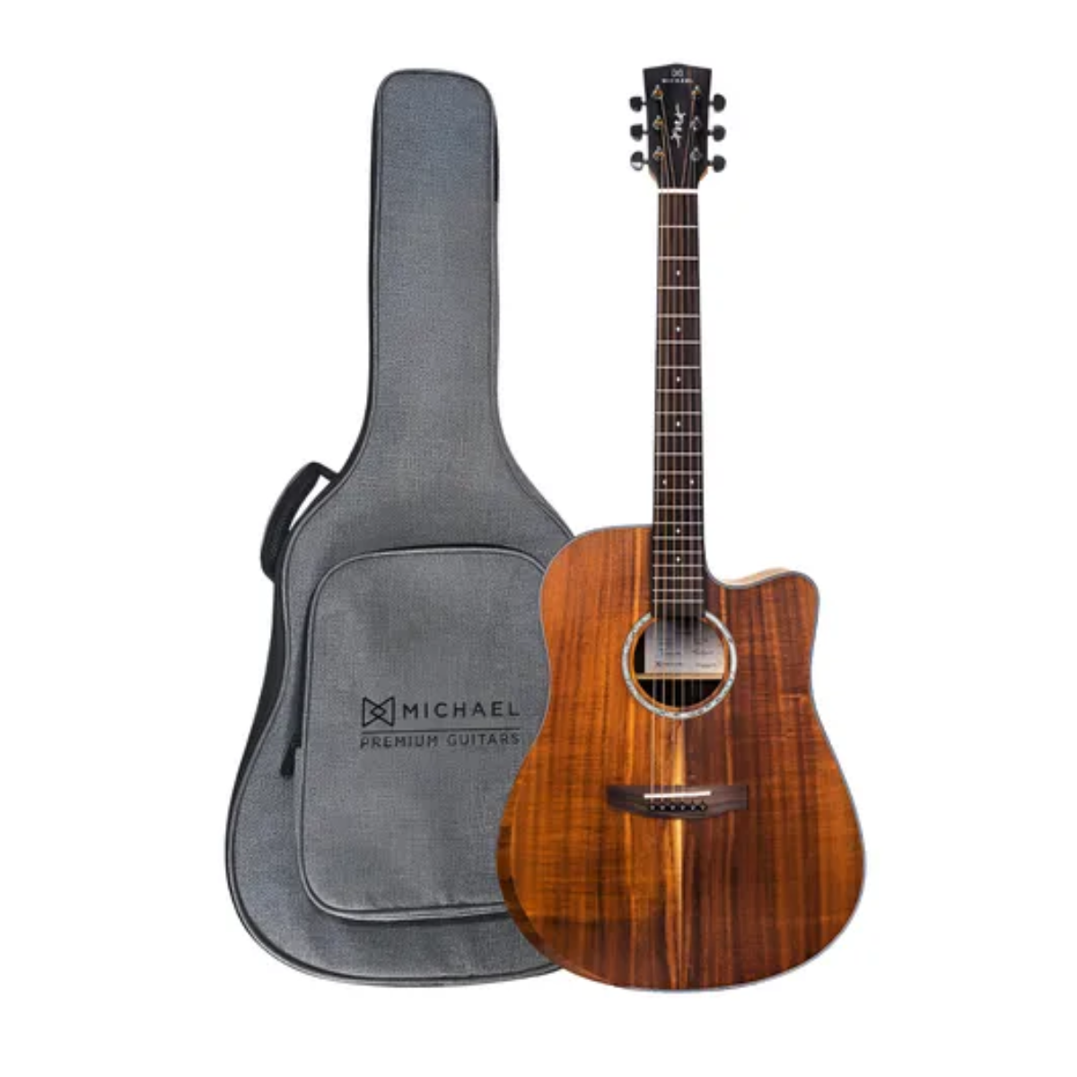 Os Violões Michael Imperial Koa possuem tampo sólido em Koa, laterais e fundo também em Koa, madeira nobre e exuberante, valorizada tanto pela sua beleza natural quanto por sua resposta sonora quente e expressiva. Oferecendo médios encorpados, agudos suaves e articulados, e graves presentes, resultando em um timbre cheio de personalidade e harmonia — ideal para músicos que exigem projeção, definição e equilíbrio total.